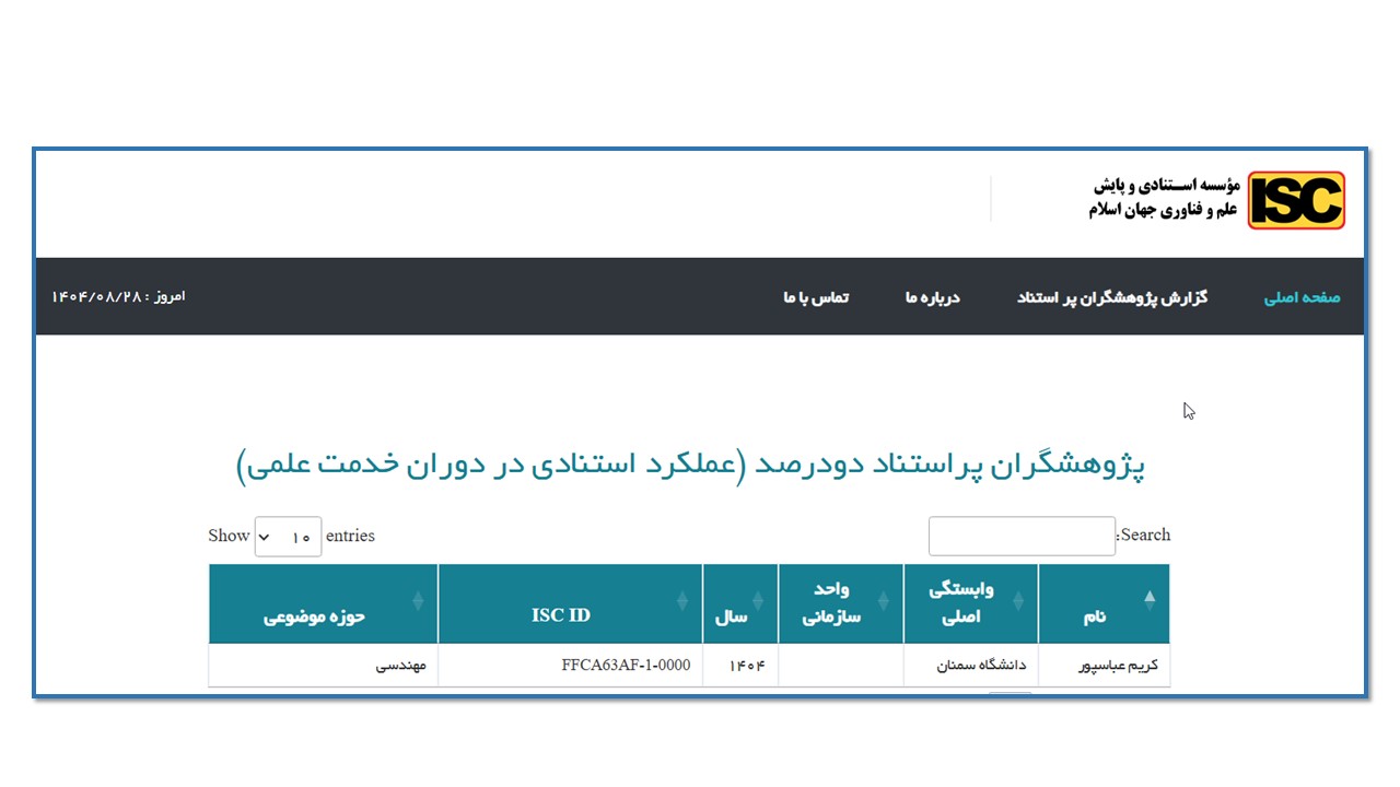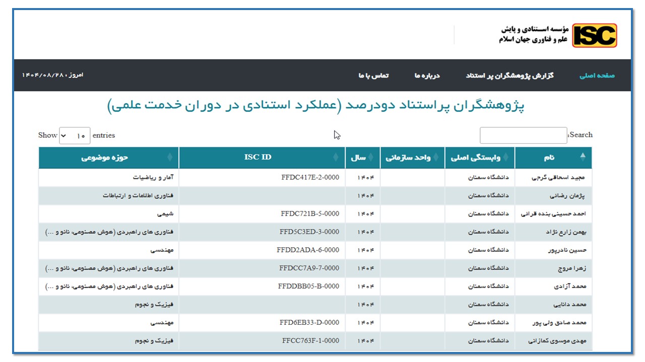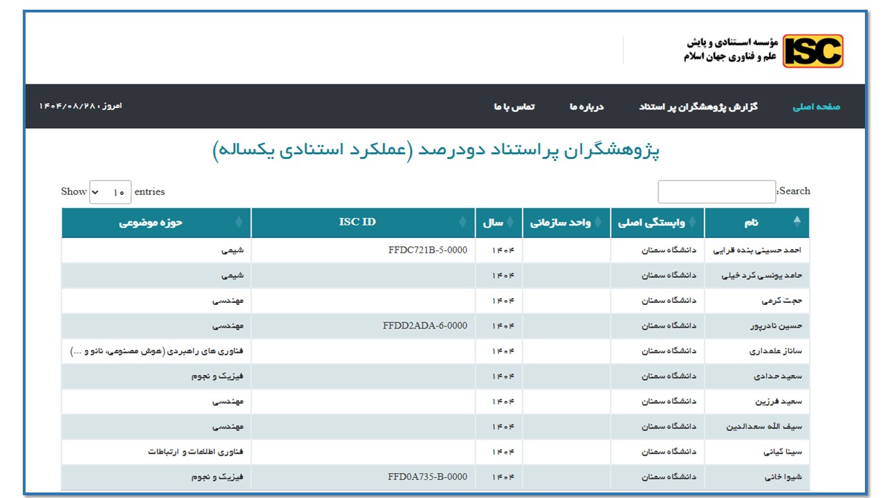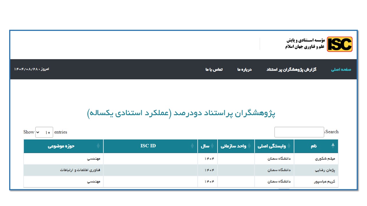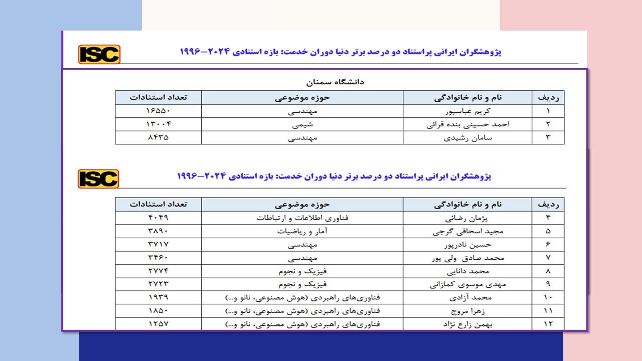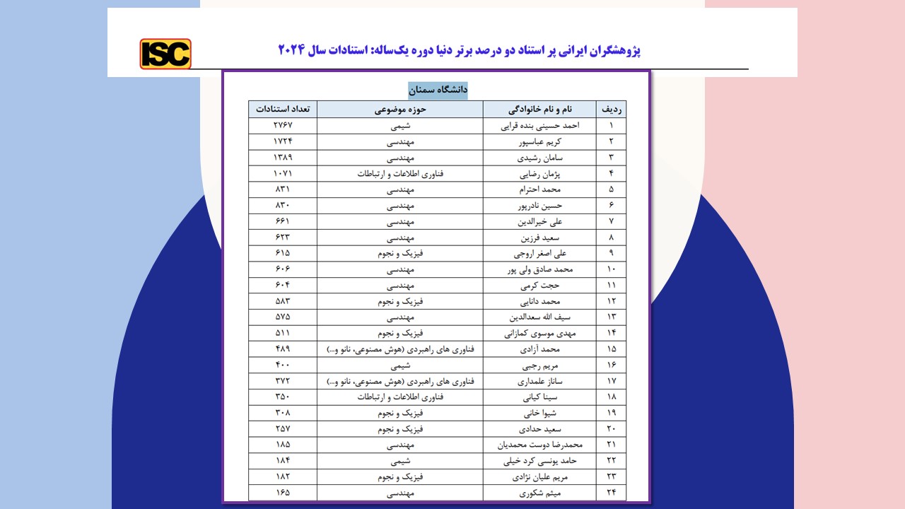 به گزارش رابط خبری حوزه معاونت پژوهش و فناوری دانشگاه سمنان، دکتر محمد حسین احسانی با اعلام این خبر گفت : در تازهترین بهروزرسانی پایگاه ISC که در شهریورماه ۱۴۰۴ (سپتامبر ۲۰۲۵) منتشر شده است، 26 پژوهشگر از دانشگاه سمنان در فهرست پژوهشگران پراستناد دو درصد برتر جهان قرار گرفتهاند. این فهرست بر اساس عملکرد استنادی یکساله در سال ۲۰۲۴ و همچنین تحلیل عملکرد استنادی نویسندگان در دوران خدمت علمی از سال ۱۹۶۰ تا ۲۰۲۴ تنظیم شده است.