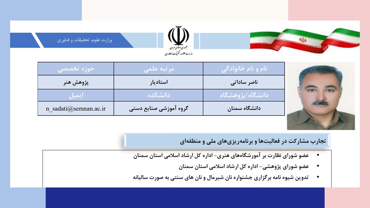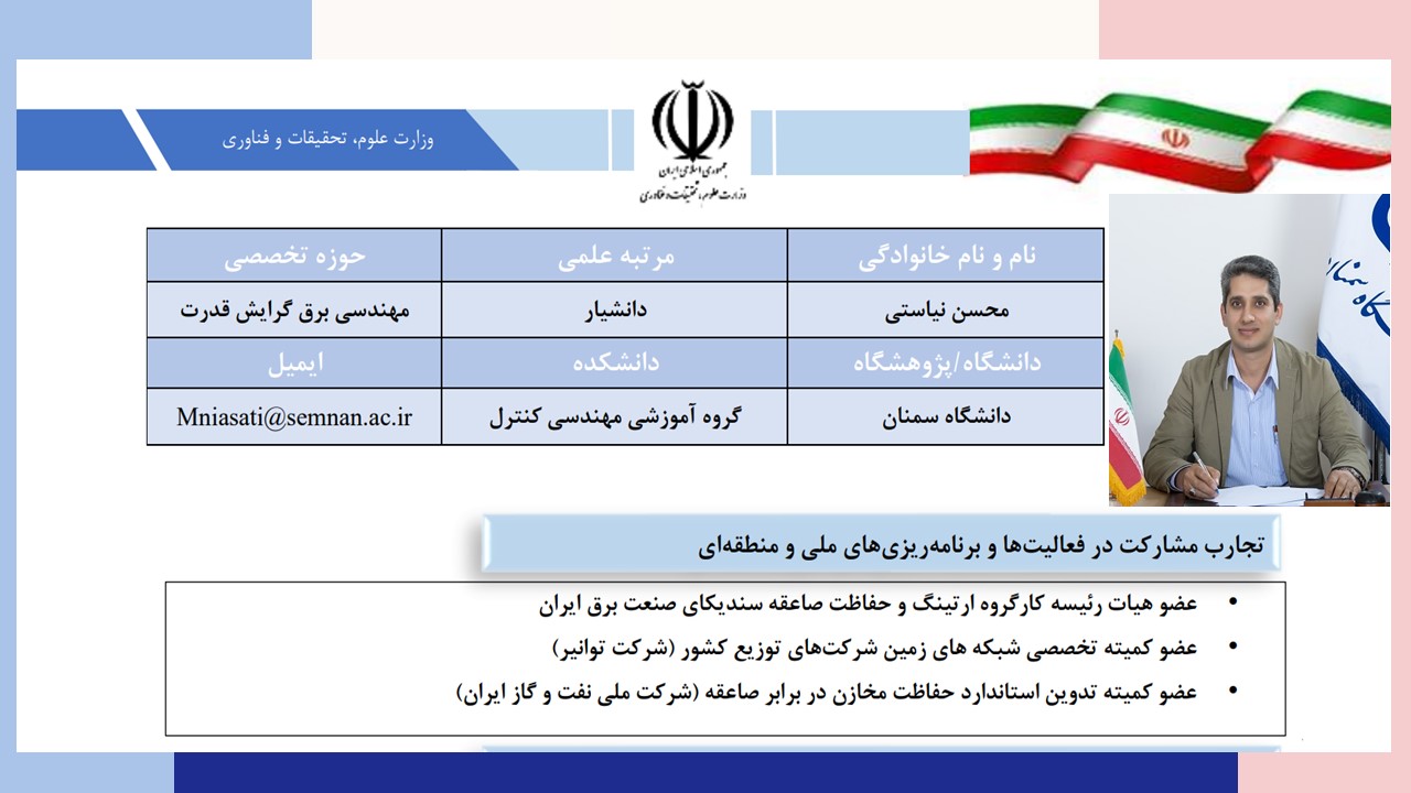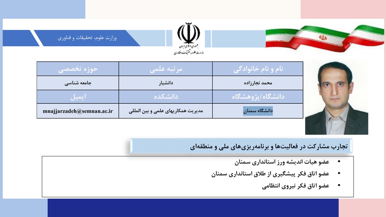 عضو هیأت رئیسه دانشگاه سمنان با بیان اینکه دکتر محمد نجار زاده دانشیار دانشکده گردشگری در حوزه تخصصی جامعه شناسی ، دکتر محسن نیاستی دانشیار دانشکده مهندسی برق و کامپیوتر در حوزه تخصصی  مهندسی برق با گرایش قدرت و دکتر ناصر ساداتی  استادیار دانشکده هنر در حوزه تخصصی پژوهش هنر  برگزیده شده اند ، تصریح کرد :