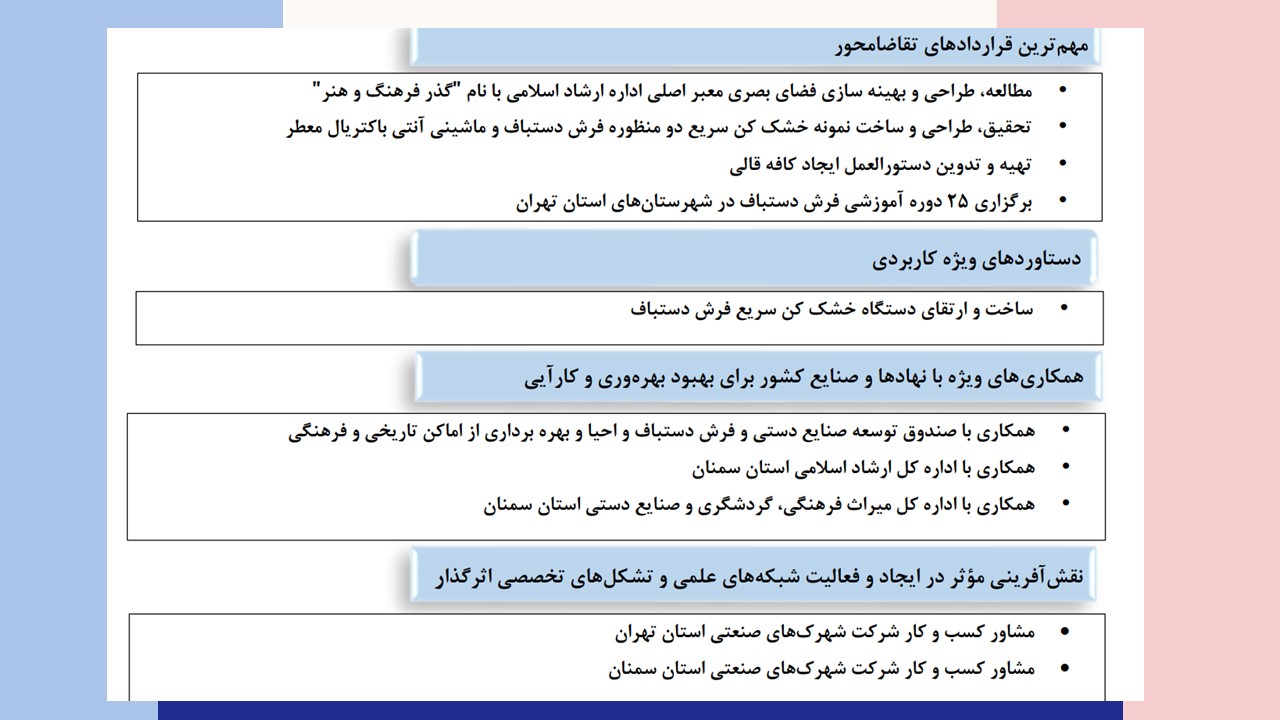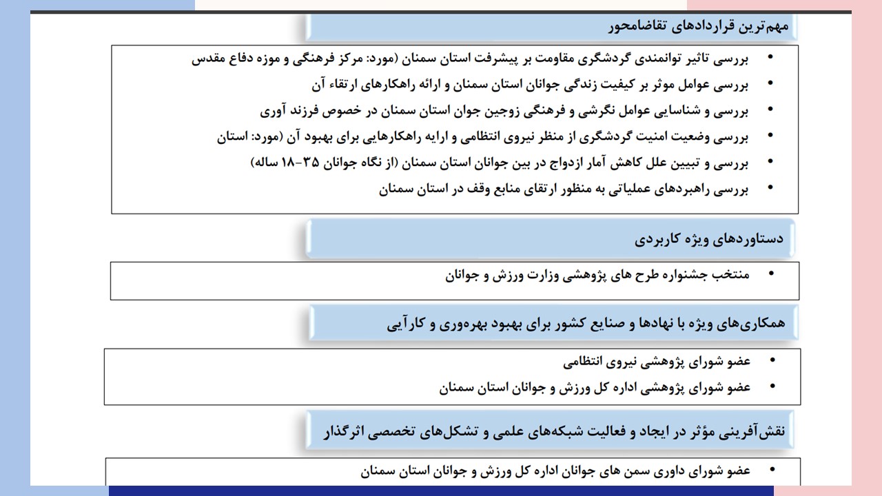 با ارزیابی صورت گرفته بر اساس شاخص های متعددی همچون : تجارب مشارکت در فعالیت ها و برنامه ریزی های ملی و منطقه ای ، انعقاد قراردادهای تقاضامحور ، دستاوردهای ویژه کاربردی و مؤثر در رفع مشکلات کشور ، همکاری های ویژه با نهادها و صنایع کشور برای بهبود بهره وری و کارآیی و نقش آفرینی مؤثر در ایجاد و فعالیت شبکه های علمی و تشکل های تخصصی اثرگذار این اعضای هیأت علمی توانسته اند در فهرست برترین های کشور حضور یابند.