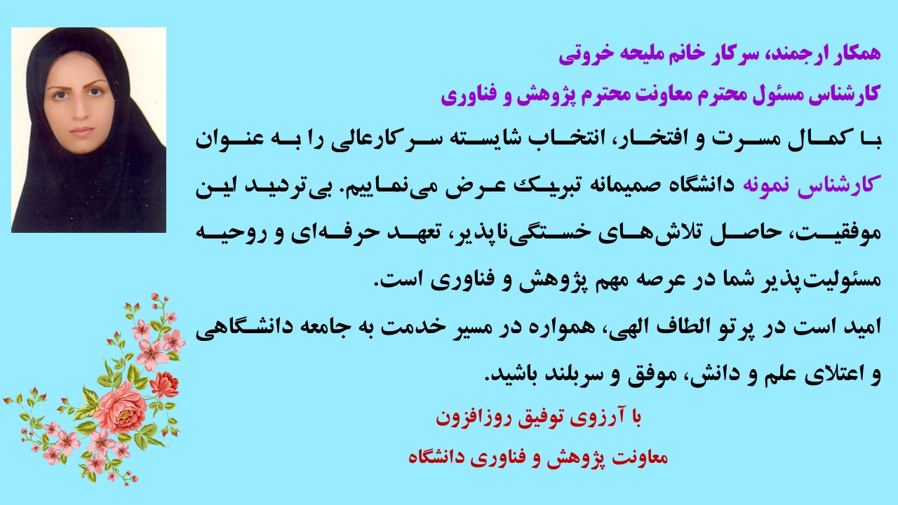 تبریک به خانم ملیحه خروتی کارشناس نمونه حوزه معاونت پژوهش و فناوری دانشگاه 1404/06/15 - 16:45 تعداد بازدید: 62 کلمات کلیدی