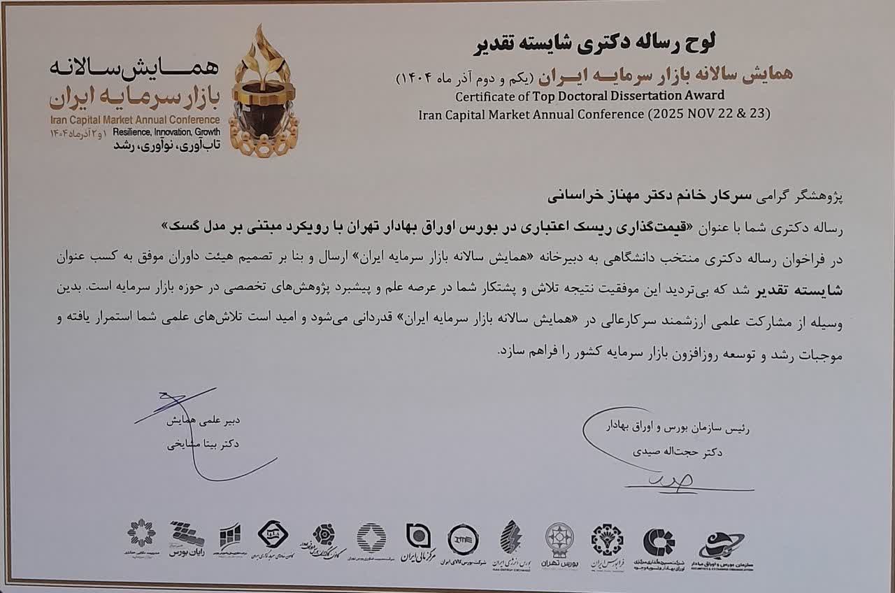 این رساله با عنوان « قیمتگذاری ریسک اعتباری در بورس اوراق بهادار تهران با رویکرد مبتنی بر مدل گسک » به دلیل نوآوری، کاربردی بودن و رویکرد تحلیلی پیشرفته در حوزه مالی مورد توجه داوران قرار گرفت.