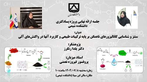 وی با اعلام این خبر افزود: « این دوره با عنوان "سنتز و شناسایی کاتالیزورهای ناهمگن بر پایه ترکیبات طبیعی و کاربرد آن‌ها در واکنش‌های آلی " و با راهنمایی علمی سرکار خانم دکتر فیروزه نعمتی، استاد شیمی آلی دانشگاه، در بازه زمانی تعیین‌شده با موفقیت به انجام رسید.»