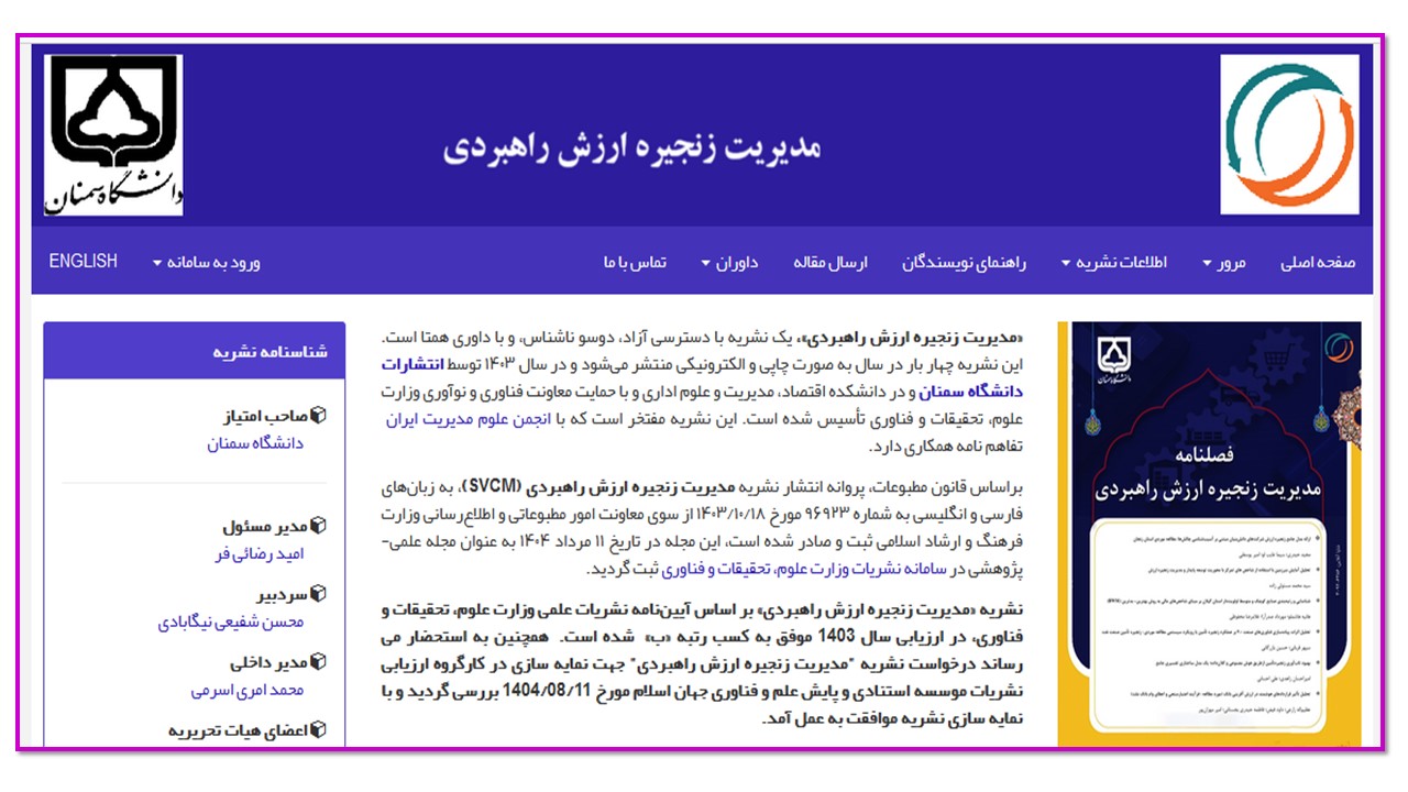 نشریه مدیریت زنجیره ارزش راهبردی دانشگاه سمنان به جمع مجلات نمایه‌شده در پایگاه ISC پیوست