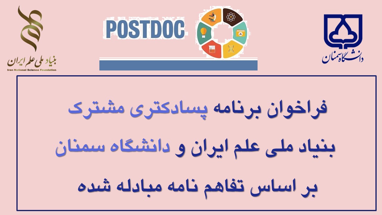 دانشگاه سمنان در چارچوب تفاهمنامه همکاری با بنیاد ملی علم ایران (INSF)، از پژوهشگران توانمند و علاقه مند مقطع دکتری تخصصی برای همکاری بهعنوان محقق پسادکتری (Postdoctoral Researcher) دعوت به همکاری می نماید.